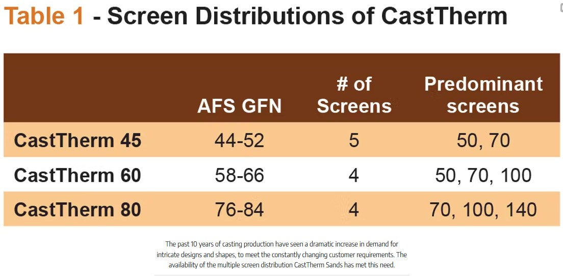 The past 10 years of casting production have seen a dramatic increase in demand for intricate designs and shapes, to meet the constantly changing customer requirements. The availability of the multiple screen distribution CastTherm Sands has met this need. Table 1 is a representation of these next-generation chromite sands. (Pictures 1, 2, and 3 show CastTherm manufacturing.)
