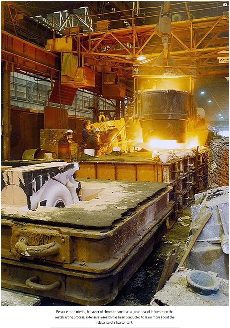 Because the sintering behavior of chromite sand has a great influence on the metalcasting process, extensive research has been conducted into sintering in many parts of the world. A primary element of researchers’ interest in is the silica content. It is important to note that the silica content is usually reported as SiO2 in the chemical analysis of chromite sand.