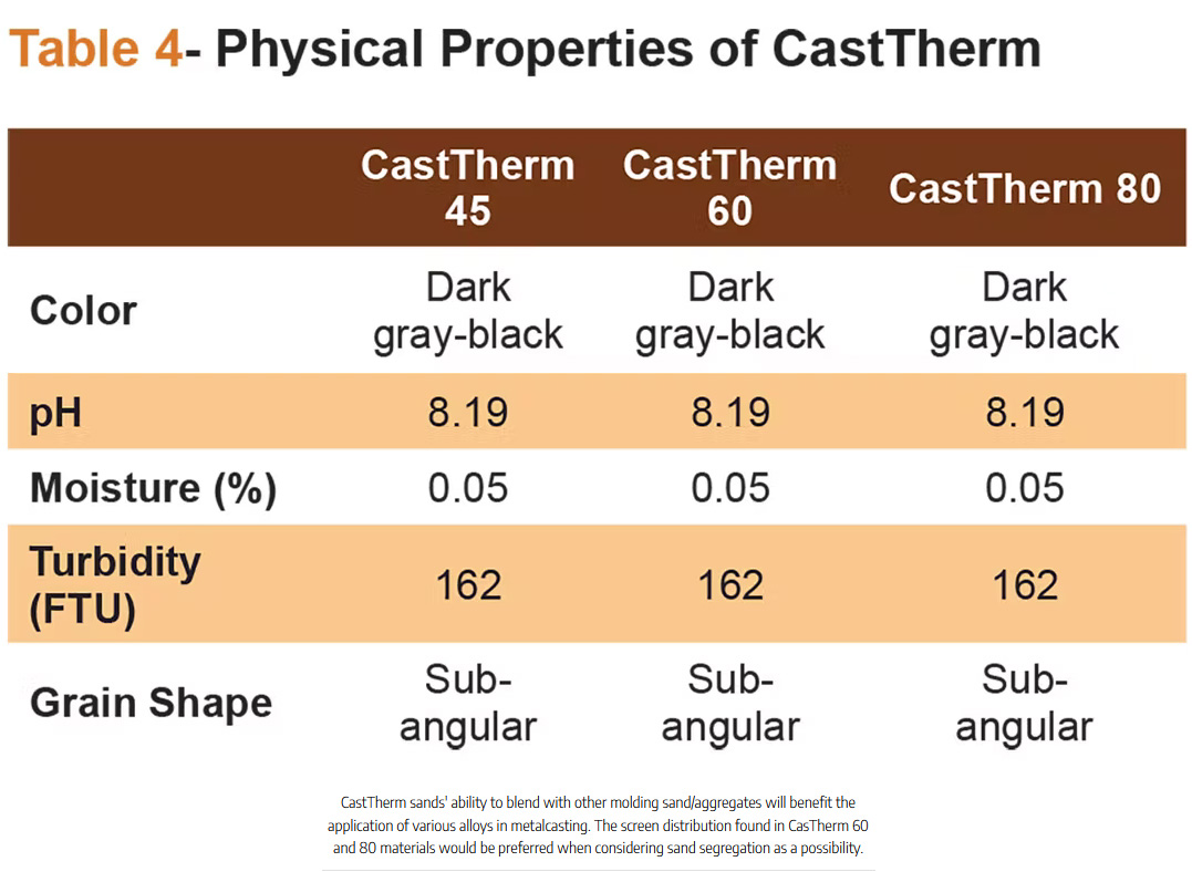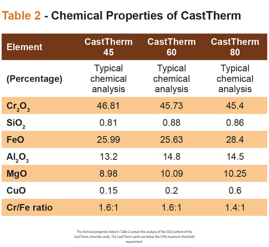 The chemical properties listed in Table 2 contain the analysis of the SiO2 content of the CastTherm chromite sands. The CastTherm sands are below the 1.0% maximum threshold requirement.