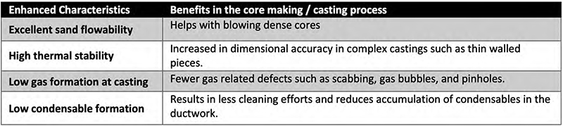 In the last 5-7 years there has been a great effort in minimizing the drawbacks of the PUCB while at the same time augmenting the distinctive traits for the binder systems. All these advances in the PUCB technology have been driven by minimizing the EH&S impact of the resins inside & out of the facility as well as improving some of the limitations previously observed. The following are some examples of resins that have cast doubt on typical stereotypes of cold box resins.