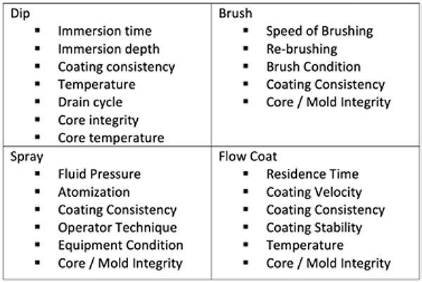 Technique. Remember the goal is to get the right amount of properly prepared coating on the core or mold every time. Whether you are dipping, spraying, brushing or flow coating, it is important to minimize variation in technique. Concentrate on several key parameters for each method. All of the following process parameters can impact coating deposit, coating penetration and the resultant barrier layer that is established at the mold metal interface.