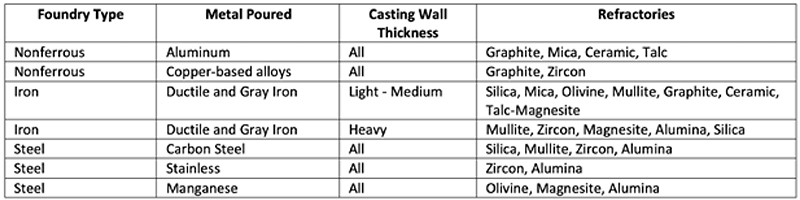 Choose the right refractory blend for your application. A refractory coating is a protective material, applied to a core or mold surface, to enhance the surface finish of the casting and reduce defects that occur at the sand-metal interface. They accomplish this by filling voids, increasing the refractoriness of the mold or core, improving sand peel, and controlling what is happening in the mold. The refractory component is the workhorse of the coating. Coating suppliers utilize a wide range of refractories and can customize a coating to your foundries needs. Open conversation with your supplier is key to getting the right coating for the job.