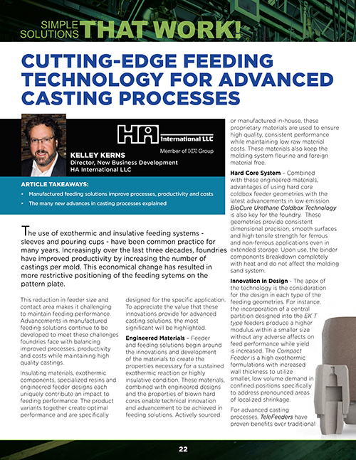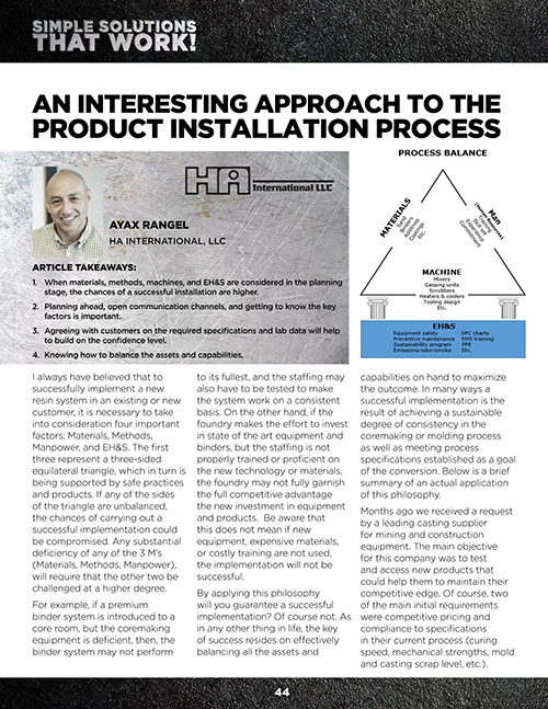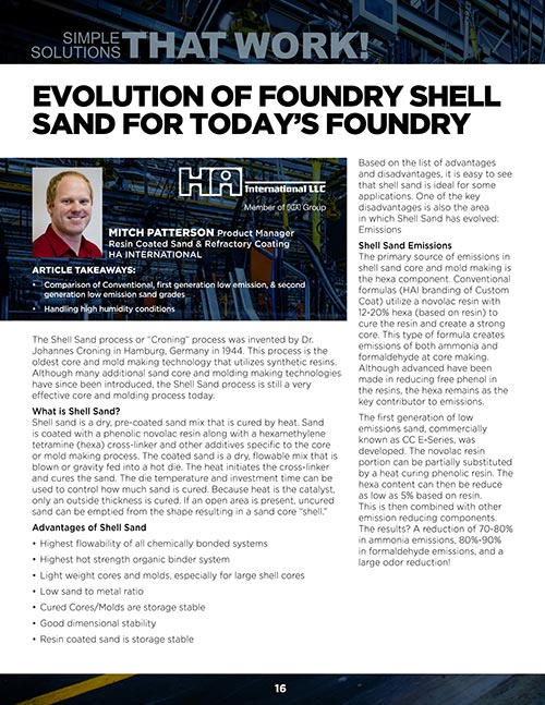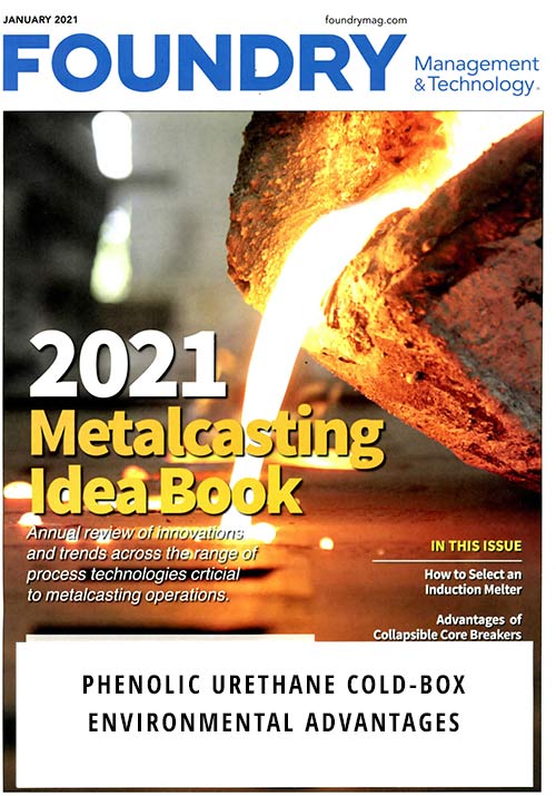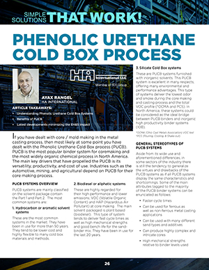 Evaluation occurred on a newly developmental phenolic urethane cold box and a modified version of this new system, utilizing the latest solvent packages found in HAI's SigmaCure series of phenolic urethane cold box (PUCB). The experimental setup of the study included computer aided modeling, analytical testing, and actual casting tests to generate cooling curves. These results, in conjunction with the temperature dependent properties were used to create simulation model datasets for the cold box sand mix in order to simulate the actual sand mold physical properties and understand how it was creating the shrinkage defects. Between 1,500-2,000 design iterations were conducted in modeling software to obtain a dataset that matched the results from actual lab casting results. The specific heat capacity and density results required for the simulation datasets were measured directly using instrumentation on test molds.