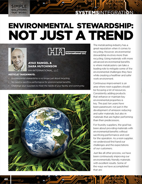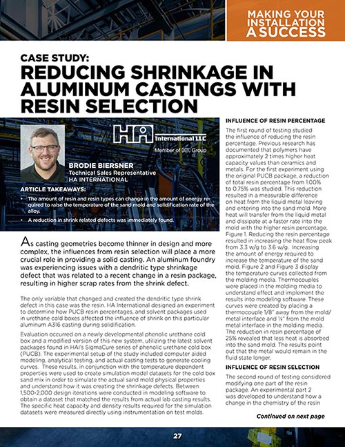 The only variable that changed and created the dendritic type shrink defect in this case was the resin. HA-International designed an experiment to determine how PUCB resin percentages, and solvent packages used in urethane cold boxes affected the influence of shrink on this particular aluminum A316 casting during solidification.