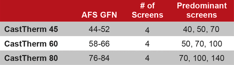 - Available GFNs - 45, 60, and 80 with normal distributions whether for heavy sections or when finer surface finish is needed for intricate detail