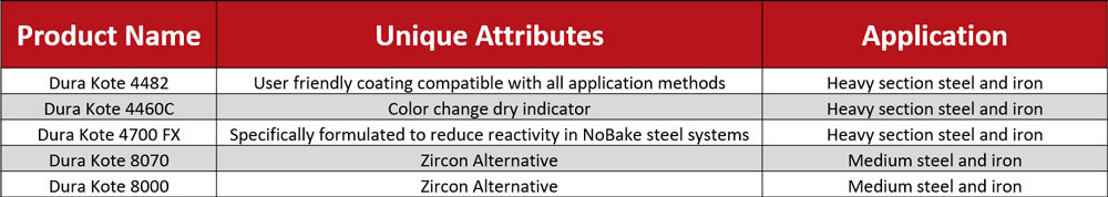 Dura Kote is a water based Refractory Coating designed specifically for Jobbing applications. Dura Kote is specifically designed for use with all No Bake sands and is extremely effective when used in the production of large section iron and steel castings. Formulated with water, Dura Kote is an environmentally sound refractory coating that provides low VOC, low HAP, and low odor.
