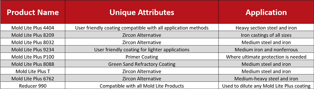 Large areas can be covered quickly and completed with flow coating which is ideal for large molds and cores. The Mold Lite Plus series offers coatings designed specifically for flow coating and other applications.